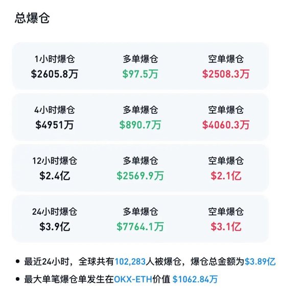 CoinGlass数据显示,过去24小时,加密货币市场共有超10万人爆仓,爆仓总金额接近4亿美元。其中,最大单笔爆仓单发生在以太坊,价值1062.84万美元。