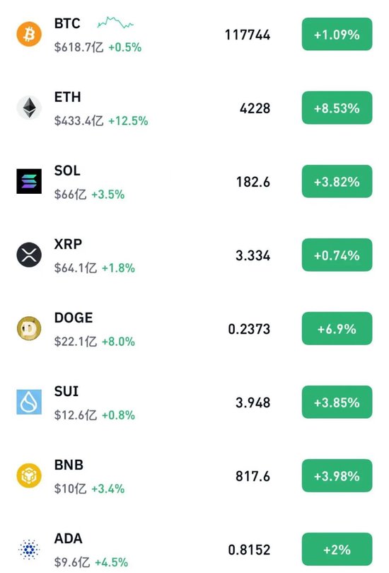 8月9日,加密货币市场全线走高。其中,以太坊站上4200美元,24小时内涨幅超过8%,总市值突破5000亿美元。比特币价格也站上117000美元,24小时内涨幅超1%。